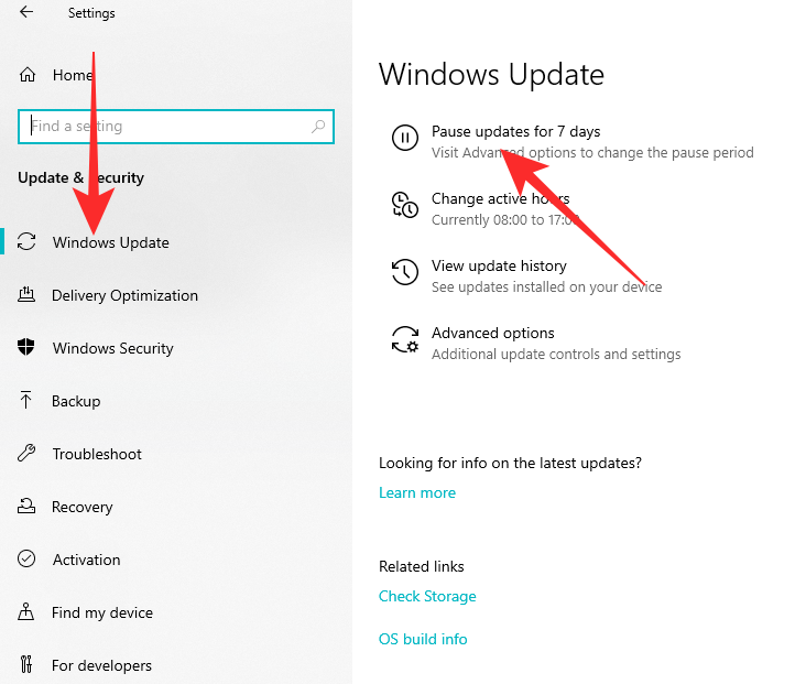 然后转到屏幕左侧的“Windows 更新”选项卡,然后选择右侧的“暂停更新 7 天”。