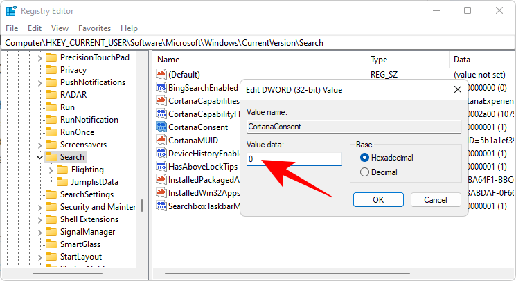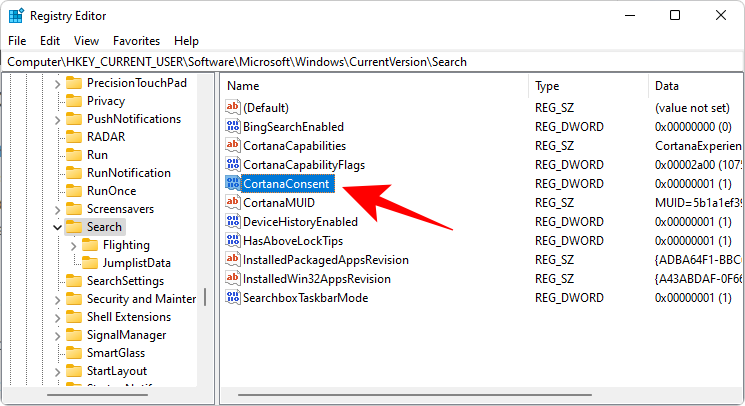 最后,在同一个密钥文件夹中,您将看到CortanaConsent DWORD 值。双击它。