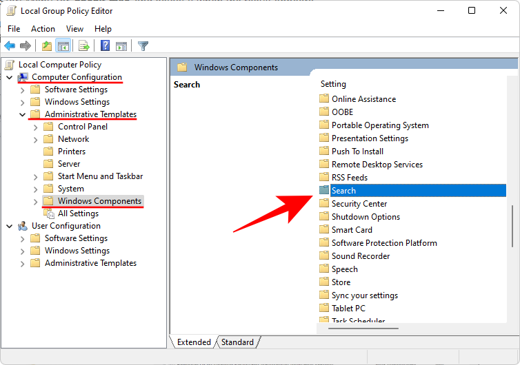 这将打开本地组策略编辑器。现在,导航到“ 计算机配置”>“管理模板”>“Windows 组件”>“搜索”。