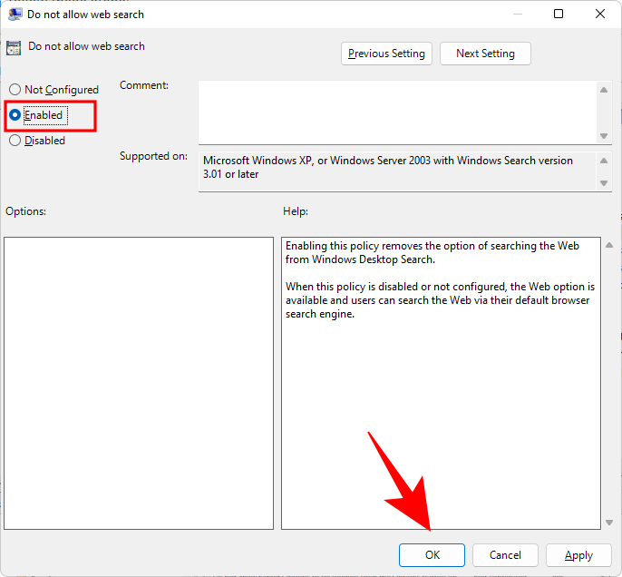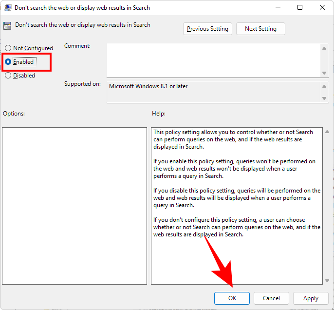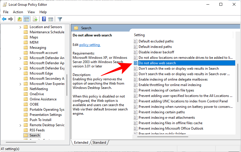 除了从注册表中禁用 Bing 外,您可能还必须将其从组策略编辑器中删除。以下是如何去做: