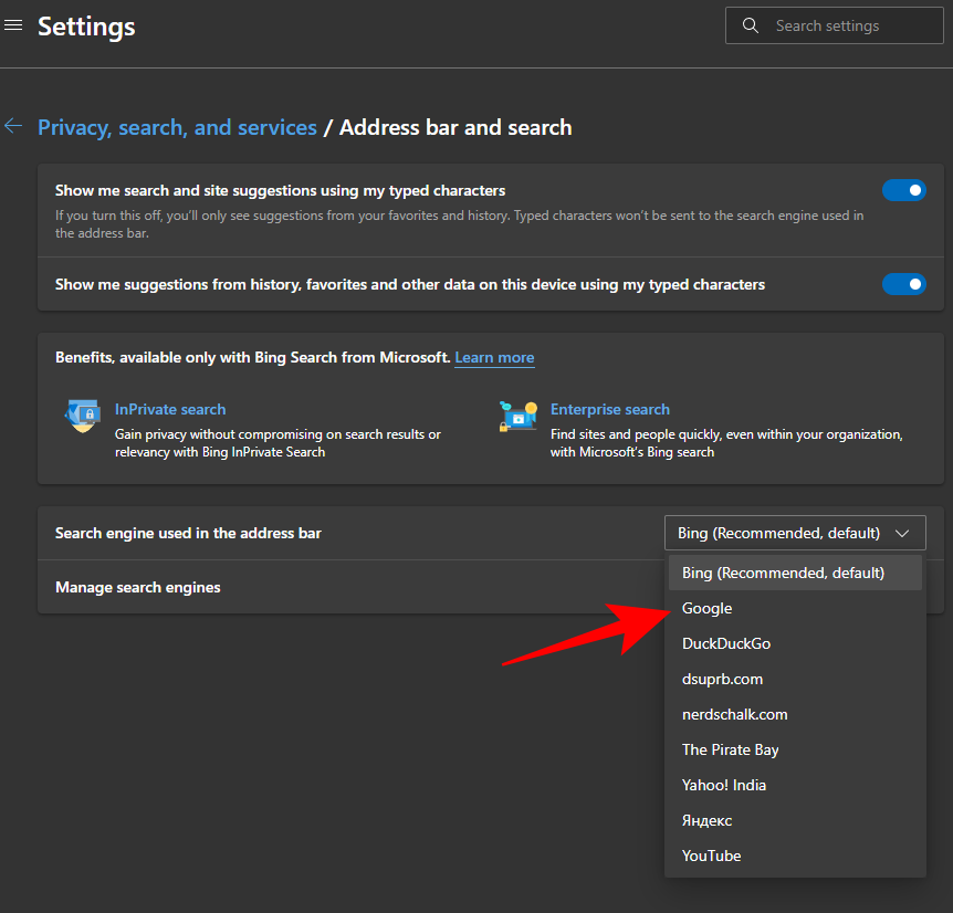 单击地址栏中使用的搜索引擎旁边的下拉菜单 。