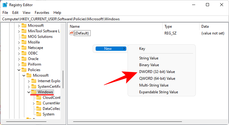 按 Enter。现在,在右侧窗格中,右键单击空白区域并选择New,然后 选择 DWORD (32-bit) value。