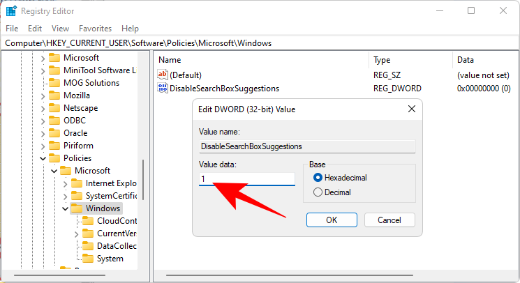 方法 #01:禁用注册表中的 Bing 搜索建议