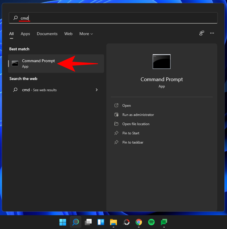 现在按开始,键入 cmd,然后选择命令提示符应用程序。
