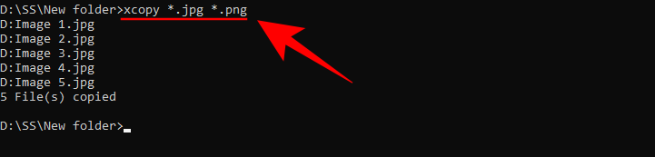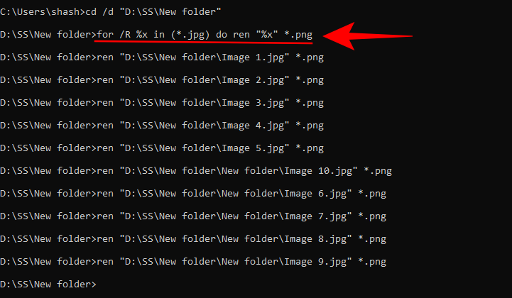 确保将“ext1”替换为当前的文件扩展名,将“ext2”替换为新的文件扩展名。在我们的示例中,我们将 JPG 更改为 PNG。