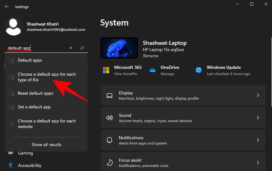 按下Win + I以打开“设置”应用程序。然后点击左侧的搜索栏。键入“默认应用程序”,然后选择 为每种文件类型选择默认应用程序。