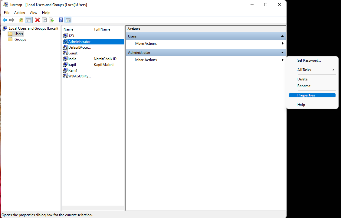 单击 右侧的管理员。现在,单击“更多操作”,然后单击“属性”。