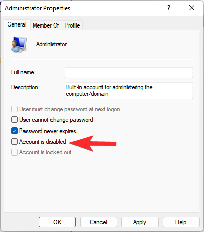 现在将在您的屏幕上启动一个新窗口。取消选中“帐户已禁用”选项。