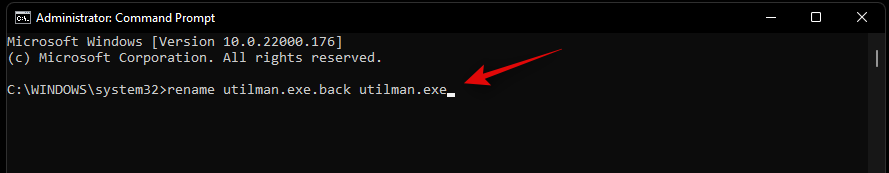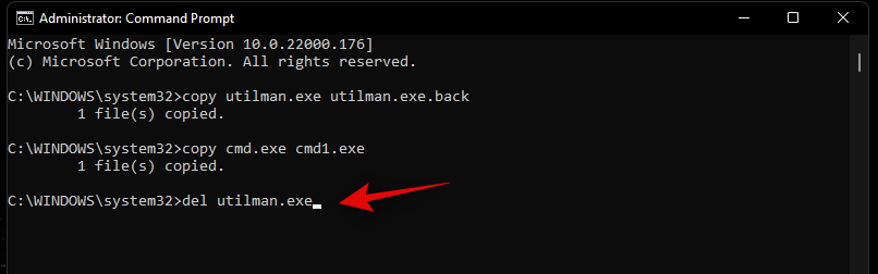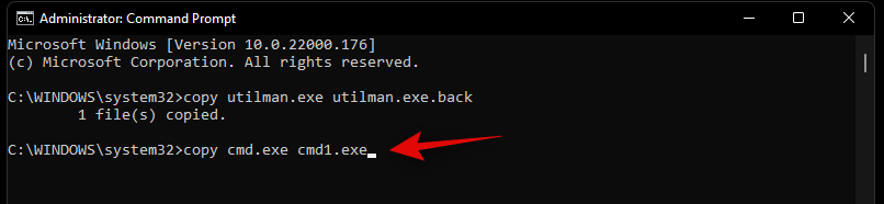 您现在将位于 System32 目录中。执行以下命令来创建 utilman.exe 的备份。