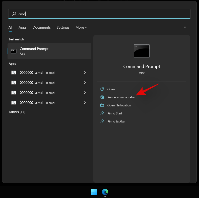 按下Windows + S键盘并搜索 CMD。一旦应用程序出现在您的搜索结果中,点击“以管理员身份运行”。