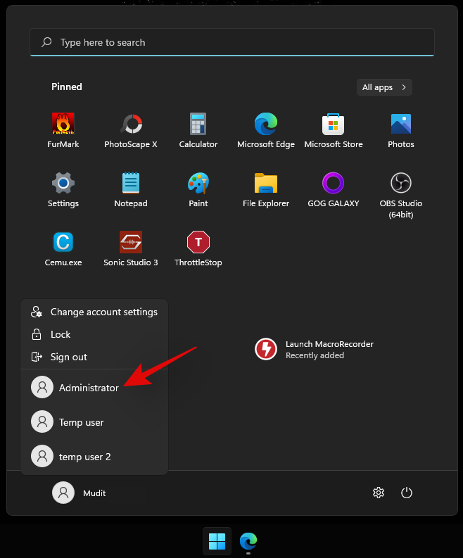 现在关闭 GPO 窗口,然后按键盘上的 Windows 键打开“开始”菜单。现在单击屏幕左下角的用户名,现在应该可以使用一个新的管理员帐户。