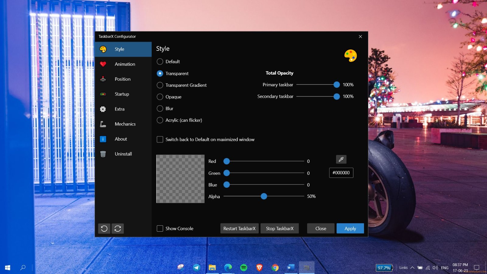 在这里,我将其保留为透明样式,在主屏幕上看起来非常酷。如果您希望任务栏在全屏应用程序中恢复到原始样式,您可以选择“在最大化窗口时切换回默认设置”。