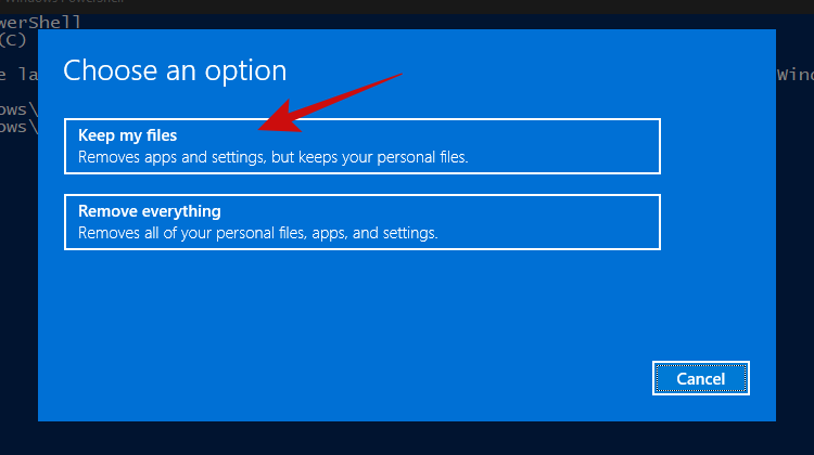 现在输入“系统重置”并按回车键。您应该看到两个选项,要么保留所有文件,要么删除所有文件。单击“保留我的文件”。