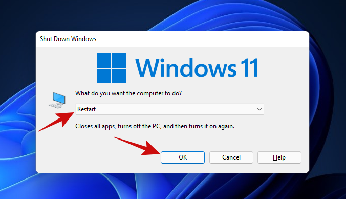 单击下拉菜单,选择“重新启动”,然后按“确定”按钮。