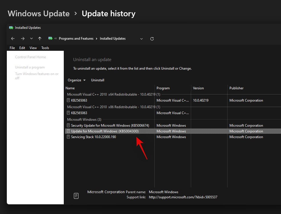 修复 #1:卸载并重新安装 Windows 更新 KB5004300