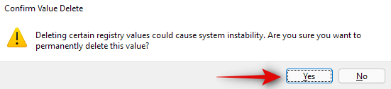 按键盘上的 Delete 键并确认您选择删除注册表值。