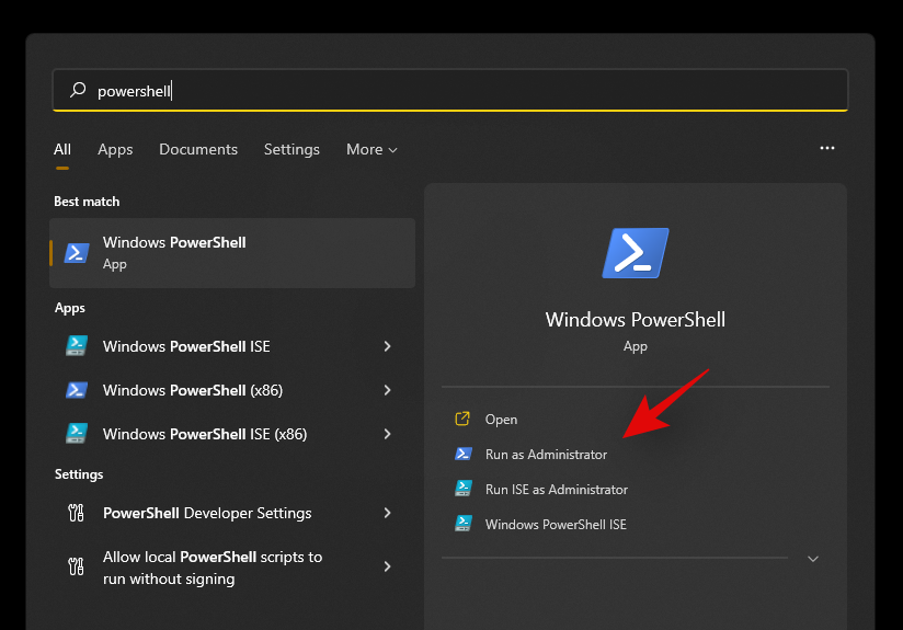 按下 Windows + S 键盘并搜索 PowerShell。一旦应用程序出现在您的搜索结果中,点击“以管理员身份运行”。