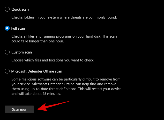 我们建议您在选择最后的手段之前尝试运行恶意软件扫描。如果任何恶意软件或恶意服务导致“开始”菜单出现问题,则扫描将有助于解决这些问题。使用以下指南通过 Windows Defender 运行恶意软件扫描。
