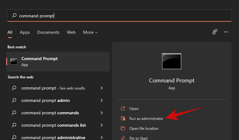打开“开始”菜单并输入“命令提示符”。确保以管理员身份运行该应用程序,如下所示。