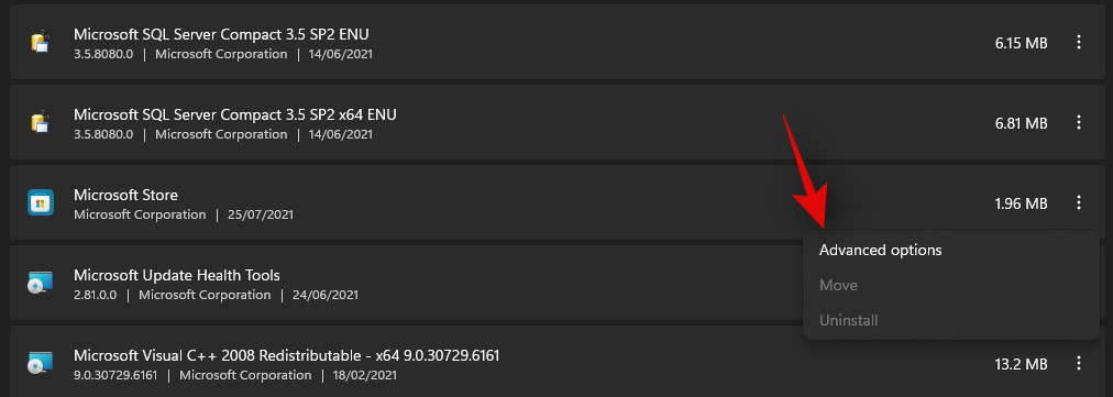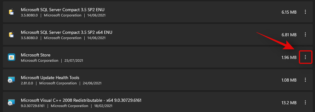 在此列表中找到“Microsoft Store”,然后单击它旁边的“三点”图标。