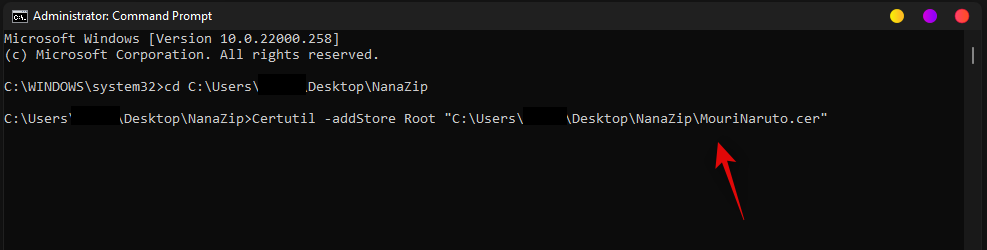 切换到CMD并执行以下命令。将 PATH 替换为在最后一步中复制到剪贴板的证书的路径。