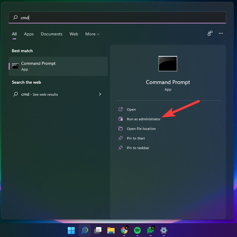 按开始,键入 cmd,然后单击“以管理员身份运行”。