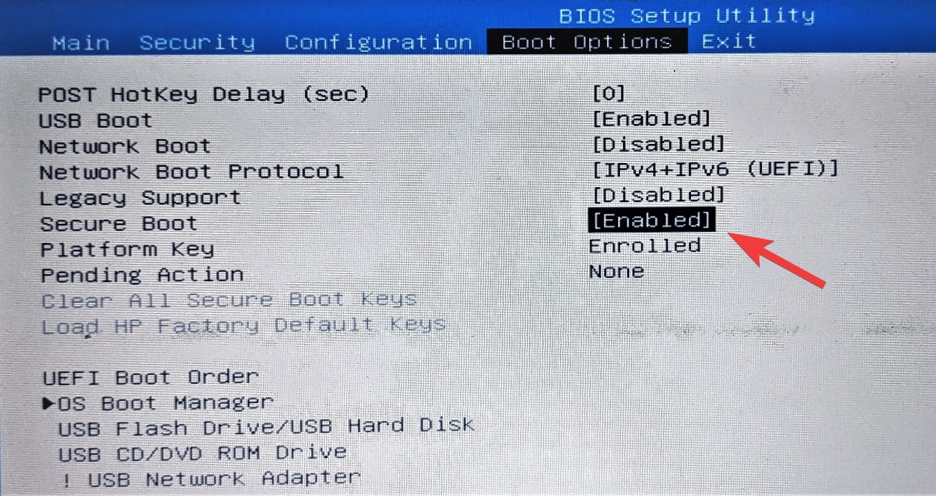 要启用安全启动状态,请确保您的磁盘采用 GPT 格式(修复 #03)并且禁用 CMS(修复 #04)。然后转到 BIOS 菜单并启用安全启动(修复 #2)。