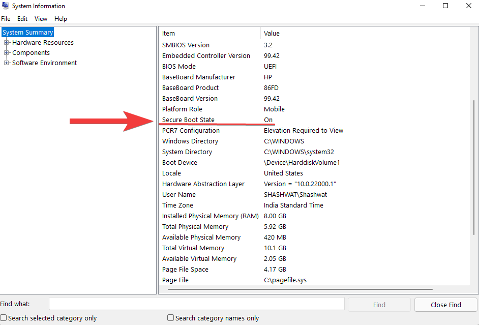 这将打开“系统信息”窗口。在这里,寻找“安全启动状态”。它的值应该是 On。