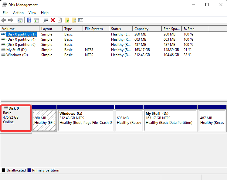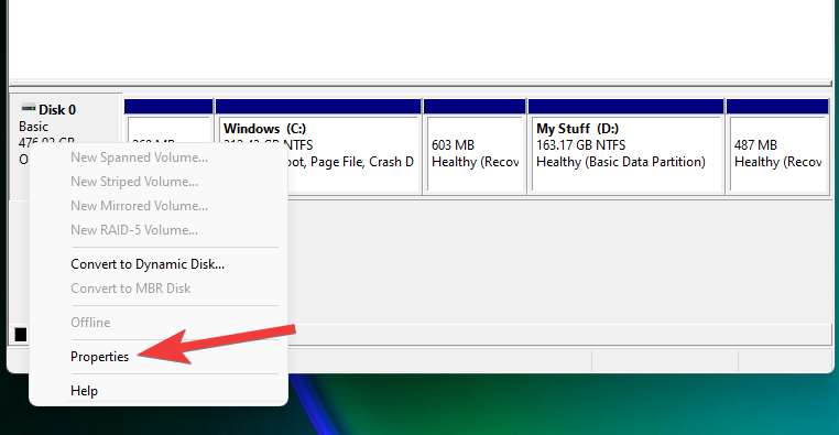 要检查系统磁盘分区的格式,请右键单击“开始”菜单并选择“磁盘管理”。