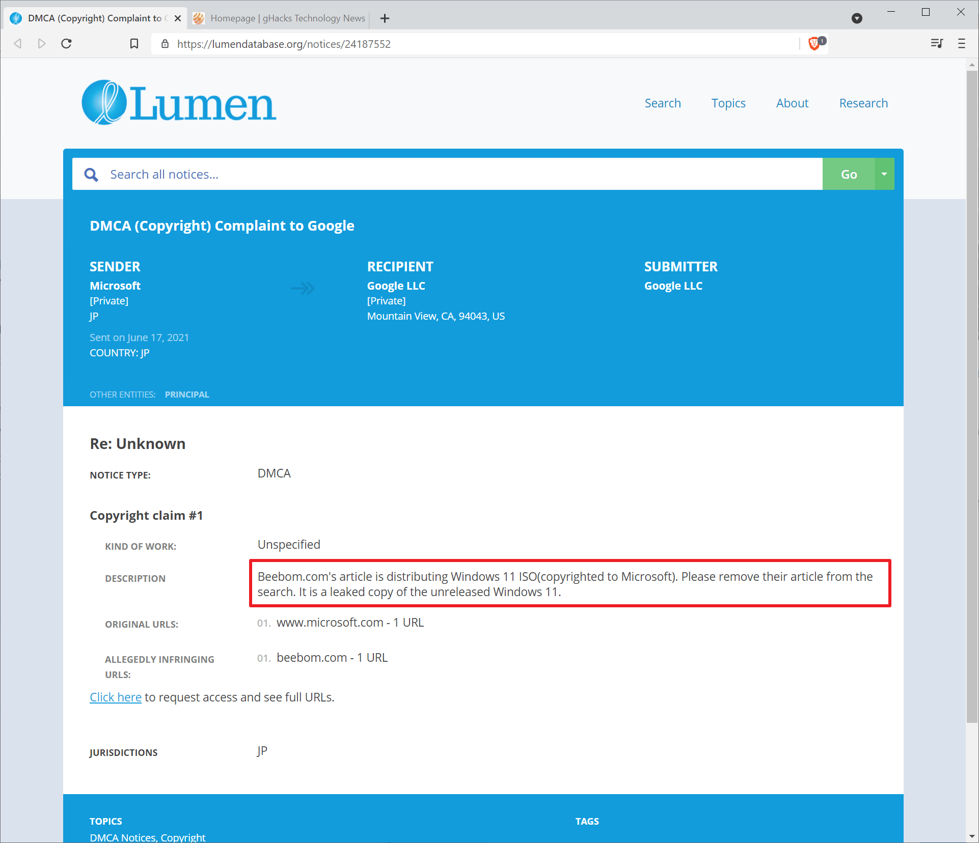 发出 DMCA 请求的最可能原因是控制操作系统版本的传播。删除请求仅针对特定站点,一旦某些内容像 Windows 11 ISO 那样传播开来,将其从 Internet 上完全删除是徒劳的。泄漏的流行可能导致副本感染恶意软件,这可能是微软在这方面的另一个担忧。