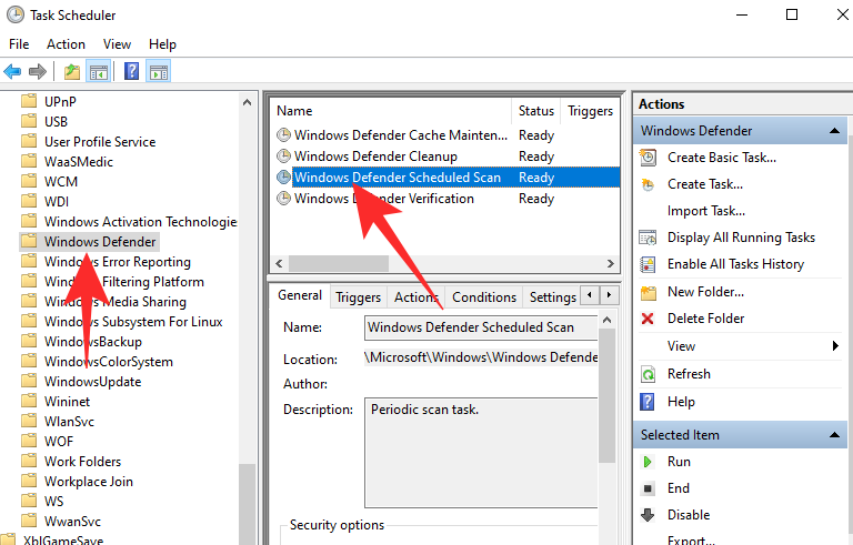 在左侧面板上,导航到 Library > Microsoft > Windows > Windows Defender。在您的右侧,您将看到进程的名称。打开“Windows Defender 预设扫描”。