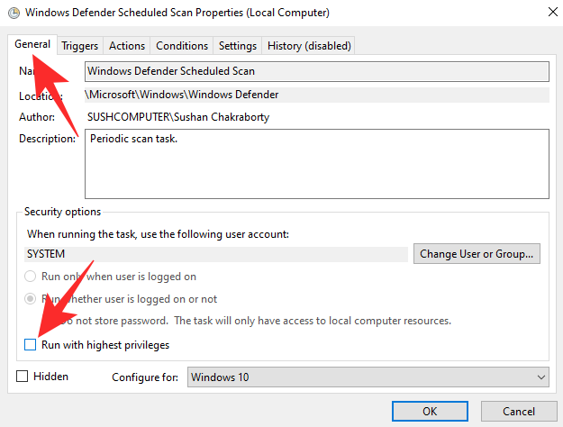 然后,转到“常规”选项卡并取消选中“以最高权限运行”选项。
