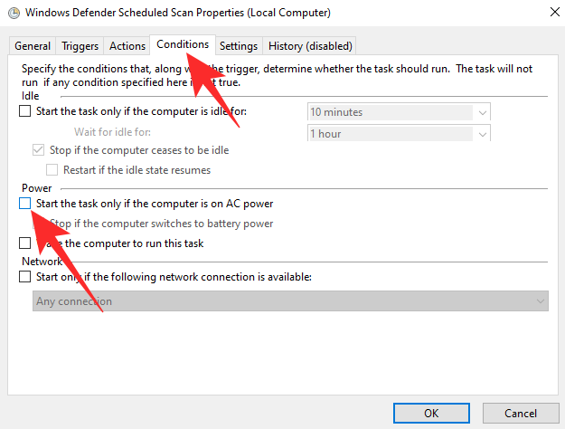 这将确保 Windows Defender 不会为单次扫描占用 CPU 资源。接下来,转到“条件”选项卡并取消选中“电源”下的选项。