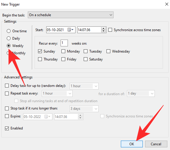 现在,将扫描设置设置为“每周”并选择合适的扫描日期。按“确定”保存更改。