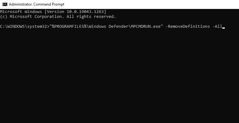"%PROGRAMFILES%\Windows Defender\MPCMDRUN.exe" -RemoveDefinitions -All