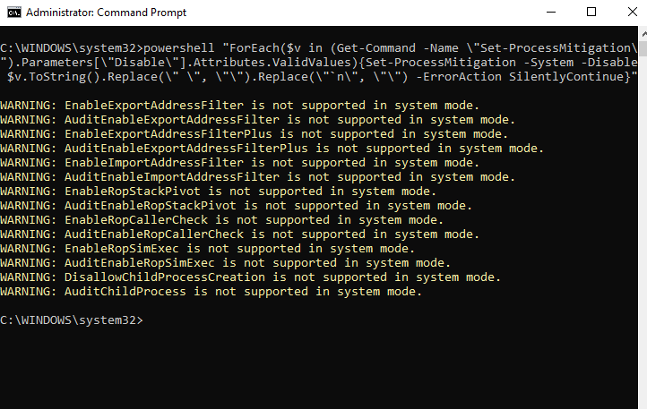 powershell“ForEach($v in (Get-Command -Name \”Set-ProcessMitigation\”).Parameters[\”Disable\”].Attributes.ValidValues){Set-ProcessMitigation -System -Disable $v.ToString(). Replace(\” \”, \”\”).Replace(\”`n\”, \”\”) -ErrorAction SilentlyContinue}”