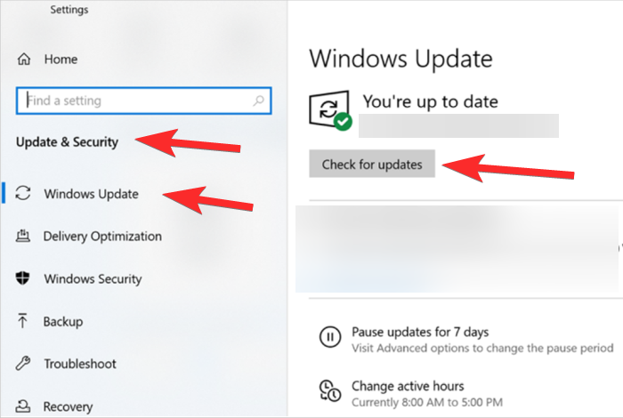 按下Windows key + i以打开Windows 10 PC 上的设置。然后,单击更新和安全,然后单击Windows 更新。现在,单击检查更新。