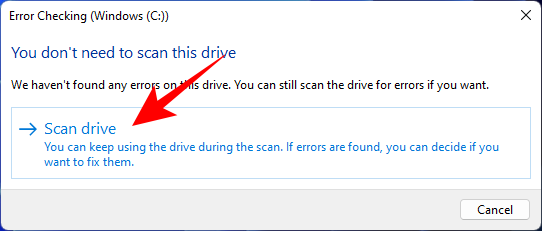 检查磁盘可能会告诉您,如果未发现驱动器错误,则无需扫描驱动器。但是,如果您无论如何都想扫描它,请单击“ 扫描驱动器”。