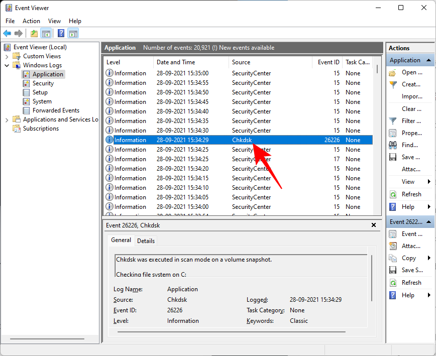 现在,在右侧,滚动日志并找到以 Chkdsk 作为“源”的日志。
