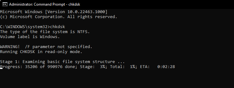 chkdsk 实用程序可以扫描并修复磁盘上发现的大多数损坏错误。只需确保您使用管理员权限运行它即可。
