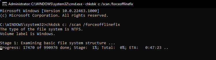 然后按 Enter。Check Disk 实用程序将识别问题并将它们排入队列以在卷脱机时解决。