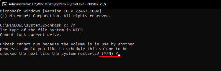 然后按 Enter。您将收到一条消息,告诉您检查磁盘“无法锁定当前驱动器……因为该卷正在被另一个进程使用”。相反,它会询问您是否要在下次系统重新启动时安排它。键入Y并按 Enter。