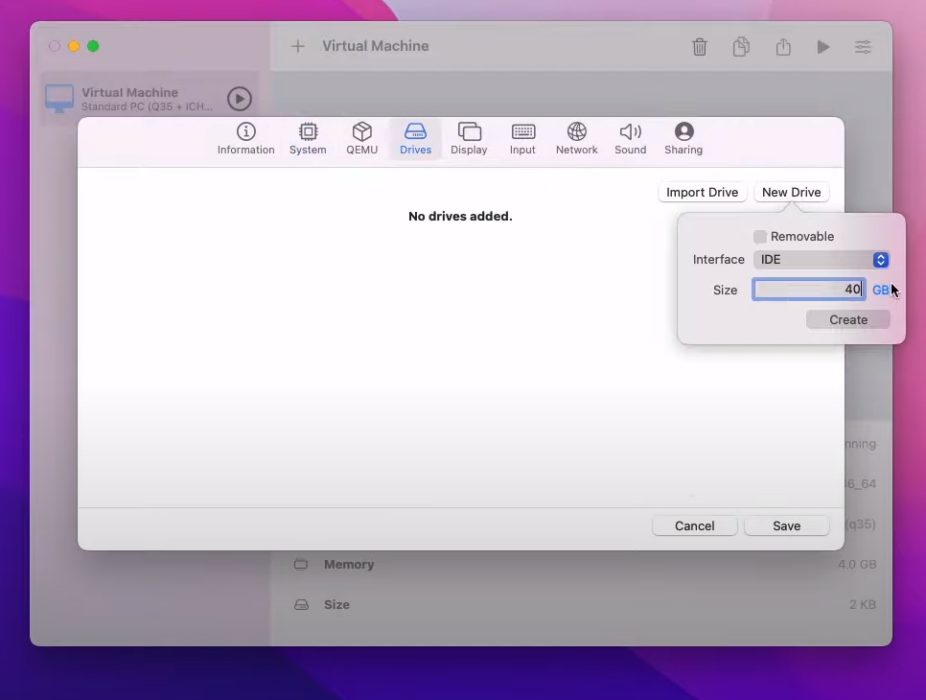 9. 保持QEMU选项卡中的设置不变。在“驱动器”选项卡中,单击“新建驱动器”按钮。