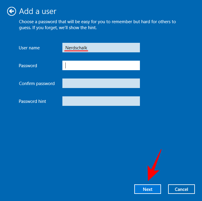 输入用户名和密码(如果您不想为此帐户设置密码,则将密码字段留空)。然后单击下一步。