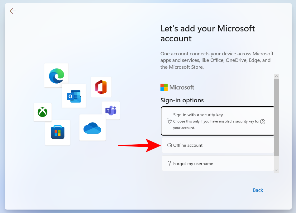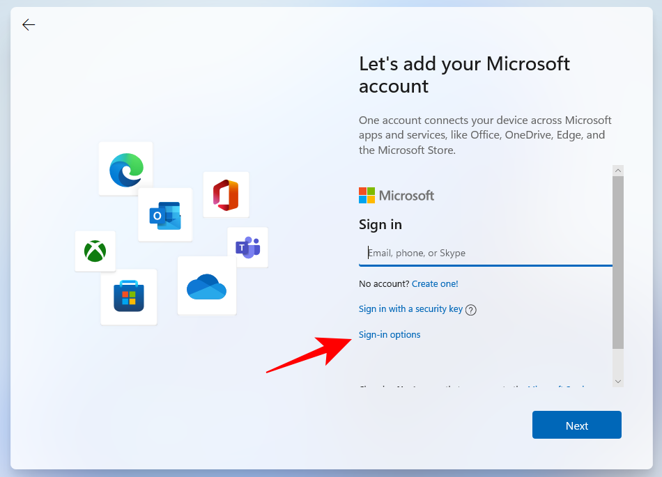 Windows 11 还为您提供了在首次设置时创建离线帐户的选项。在初始 OOBE 设置期间,当您遇到“让我们添加您的 Microsoft 帐户”屏幕时,单击“ 登录选项”。