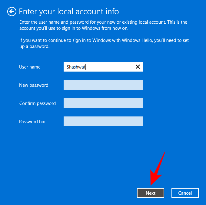 这样做将直接引导您进入本地帐户设置页面。除此之外,您以后可以随时通过我们上面指南中提到的方式添加本地帐户(在 Windows 11 上创建新用户 – 离线)。