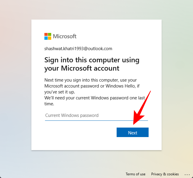 然后输入您当前的 Windows 密码(如果您没有设置密码,请将此字段留空)。单击下一步。