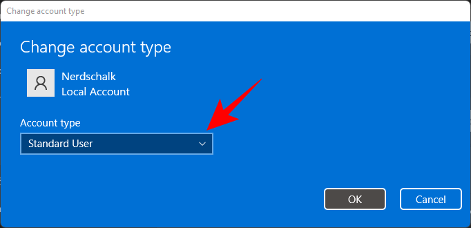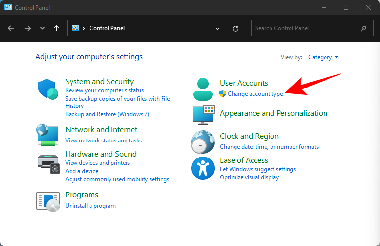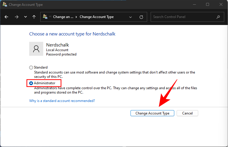 在“用户帐户”下,单击“ 更改帐户类型”。
