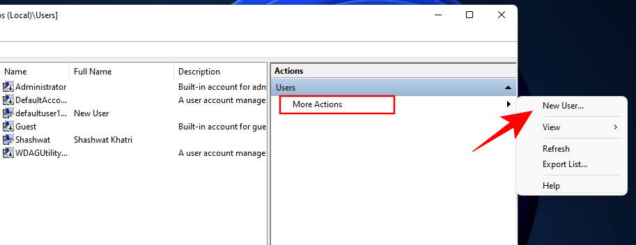 现在,在右侧面板中,单击 More Actions 并选择 New User。