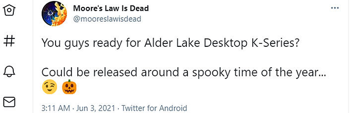 现在最重要的是,泄密者摩尔定律已死声称英特尔的 Alder Lake K 系列(125W)“可能会在一年中的一个阴森森的时间发布”,这显然是对万圣节的引用。这与 Windows 10的大更新相同。